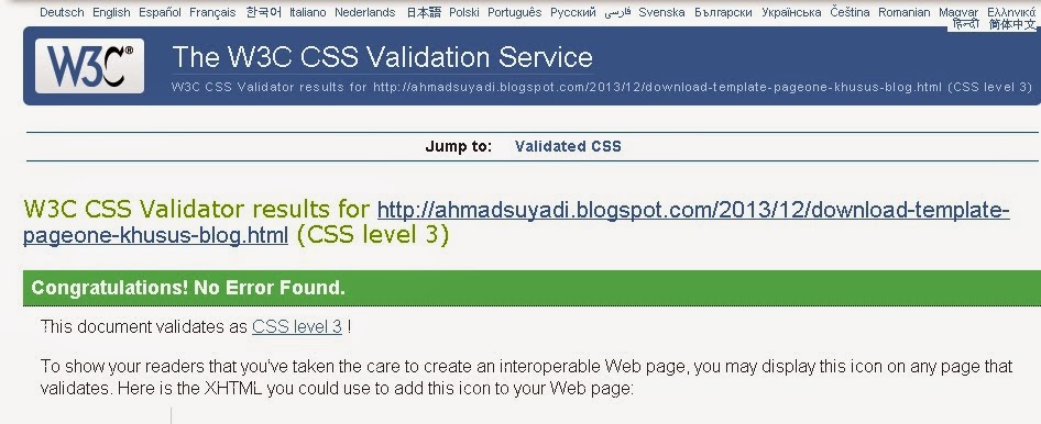 http://jigsaw.w3.org/css-validator/validator?uri=http%3A%2F%2Fahmadsuyadi.blogspot.com%2F2013%2F12%2Fdownload-template-pageone-khusus-blog.html&profile=css3&usermedium=all&warning=1&vextwarning=